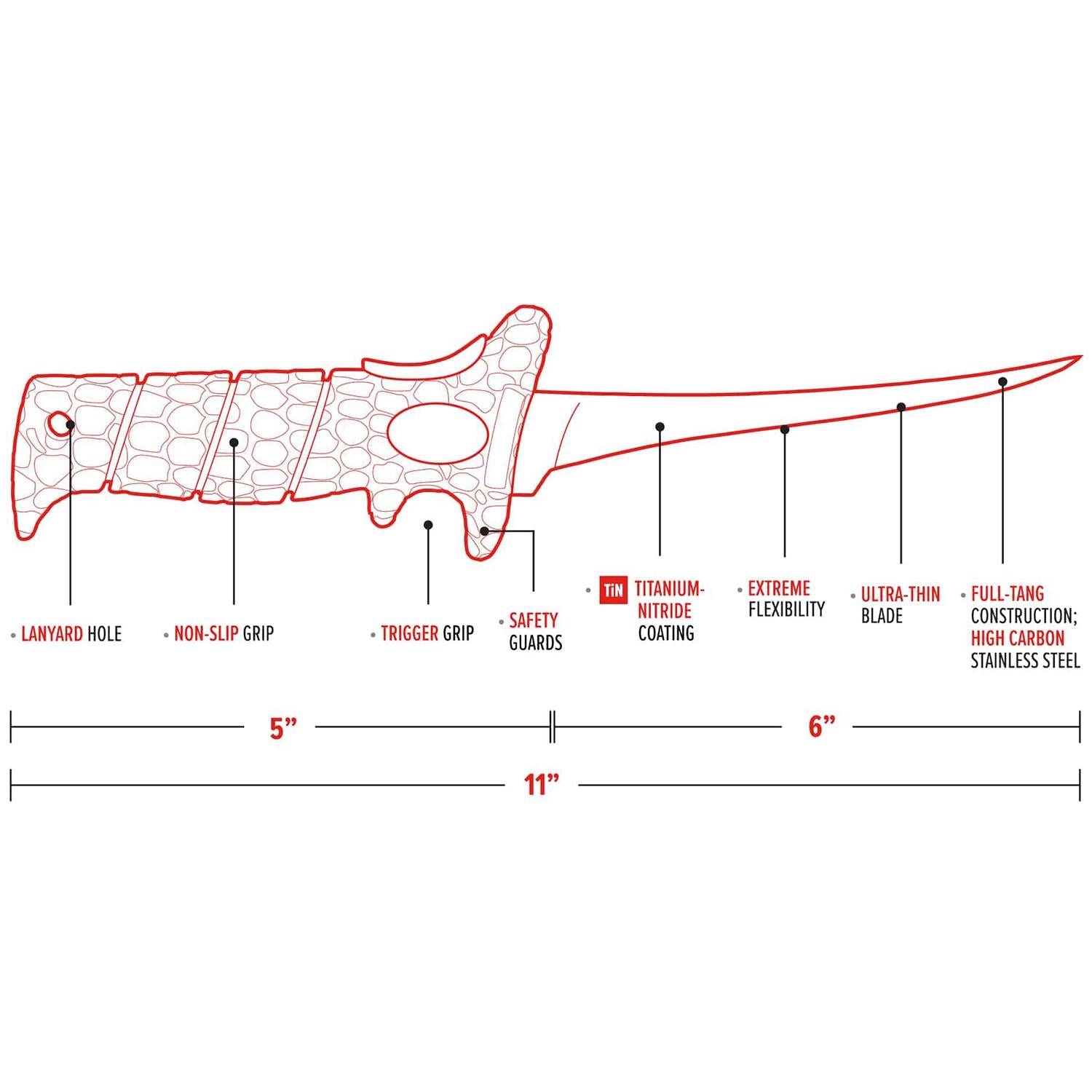 Similar to its big brother, this 6-inch Ultra Flex fillet knife comes loaded with extreme flexibility and a ridiculously thin blade. The combination of the two makes this knife essential for your collection. Bring this knife with you because its full tang construction is designed to be your go-to for everything. Whether you're cutting for detail or bone removal, it will be your best friend. Because it is the little brother to the 8-inch knife, it's suited ideally for Crappie or smaller panfish. This secret weapon is your key to success.