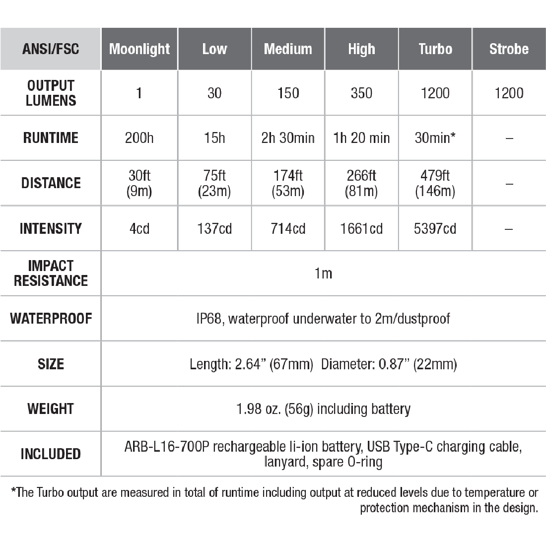 - Turbo: 1200 Lumens, 30 minutes, 479 ft