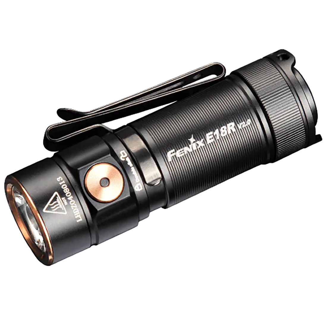 The Fenix E18R V2 is a pocket-sized powerhouse, measuring under 3 inches long yet boasting an impressive 1200-lumen maximum output and 479-foot beam throw. It's directly rechargeable with a USB Type-C fast charger and includes an ARB-L16-700P 16340 battery giving up to 200 hours of runtime with just 1.3 hours of charging. A one-lumen moonlight mode and integrated magnetic base make the E18R V2 an all-in-one EDC star. It's also highly durable with A6061-T6 aluminum construction, 1-meter drop-rating, and IP68 waterproof protection. Plus, it has self-defense strobe and two lockout methods for added safety