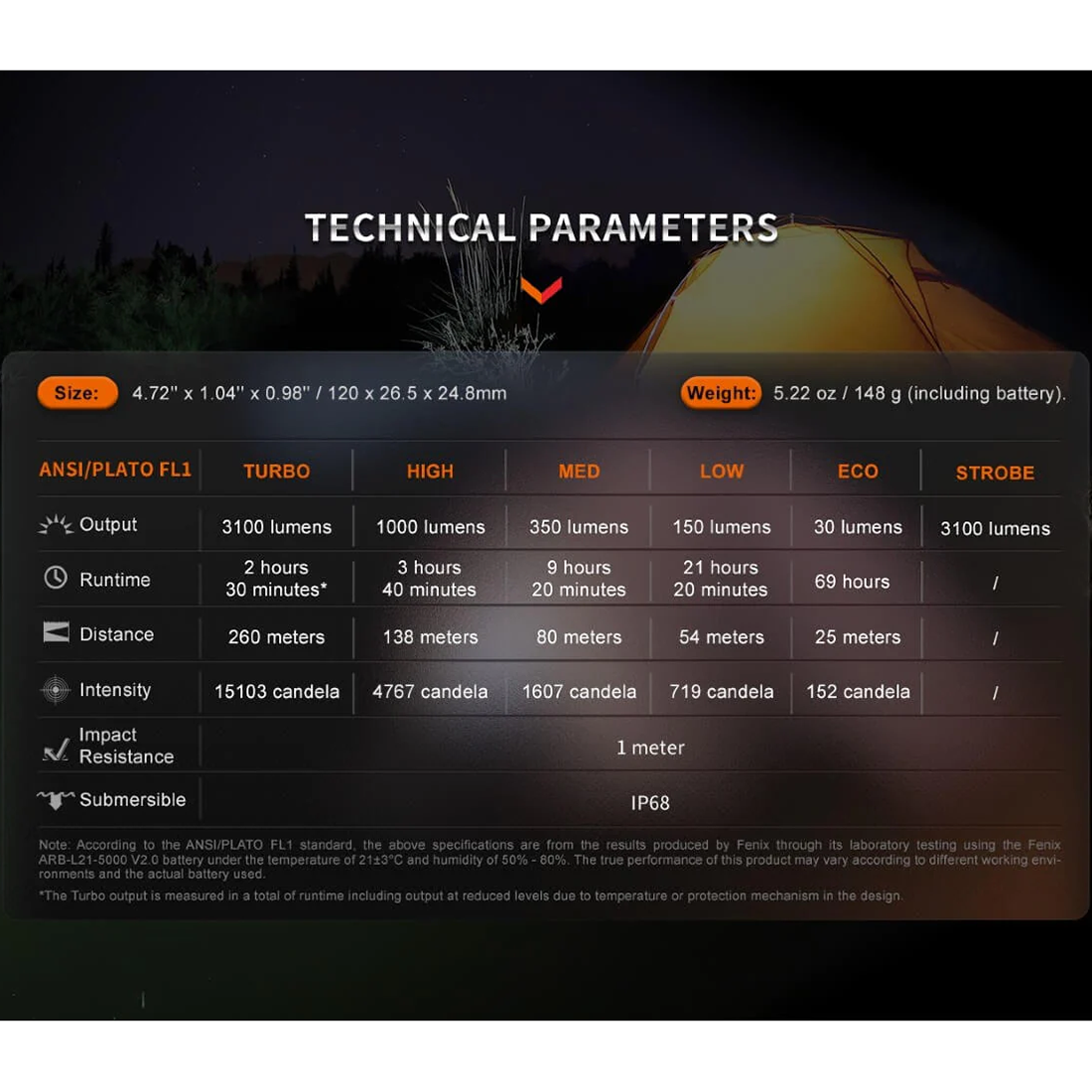 - Included: Fenix ARB-L21-5000 V2.0 5000mAh 21700 battery