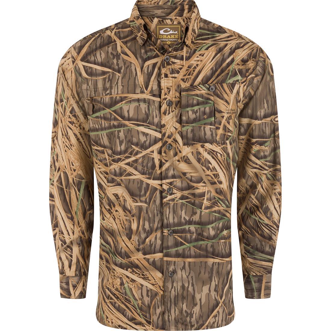 The Drake 8 Shot Shirt is made from 100% Polyester Dobby fabric featuring the exclusive Old School Camo pattern. The performance fabric is featherweight at 71 GSM which allows moisture to wick quickly from the body. It also has a UPF30 rating for sun protection and has a natural stretch for ease of movement. The Drake 8 Shot has a classic fit, a hidden button-down collar, and a vented cape back. The 8 Shot features a right chest pocket with a horizontal hidden zipper and a button through the left chest pocket with a hidden vertical zipper. It has a split tail hem which allows you to wear tucked or untucked and has an adjustable tab if you want to roll up your sleeves. Classic styling and technical features will make The Drake 8 Shot one of your soon-to-be favorites.