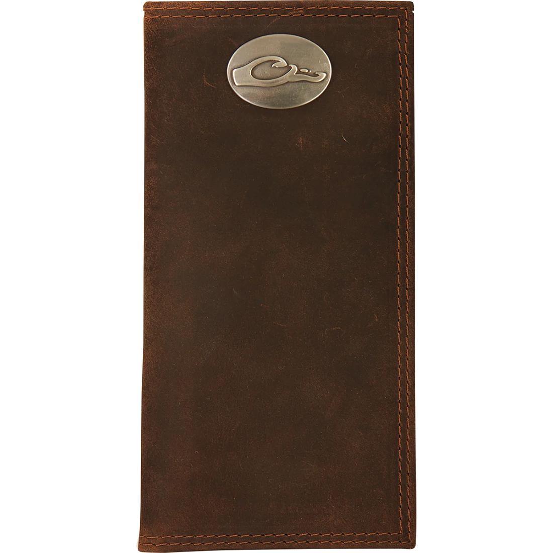 Brown Leather checkbook wallet with the Drake Logo metal oval on the outside.