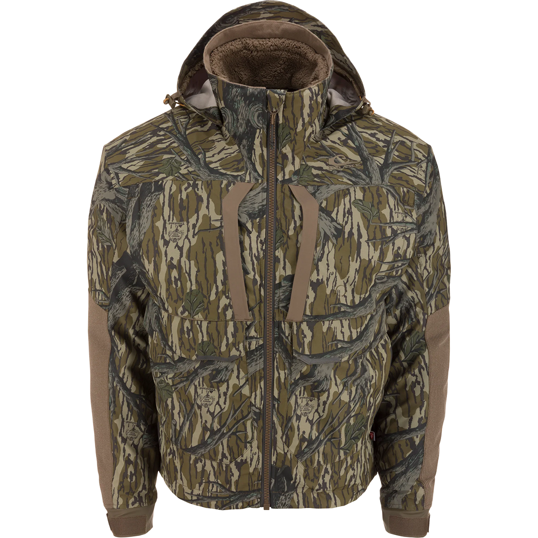 The BMF 3-in-1 Pit Jacket offers ultimate protection and versatility in demanding conditions. The rugged outer shell, crafted from highly abrasion and puncture-resistant 6oz/208 GSM 3-layer stretch ripstop polyester with a DWR finish, is reinforced with a TPU-coated ripstop. A plush 14oz/485 GSM sherpa fleece lining in the hood and handwarmer pockets, coupled with a grid fleece collar, ensures exceptional warmth.