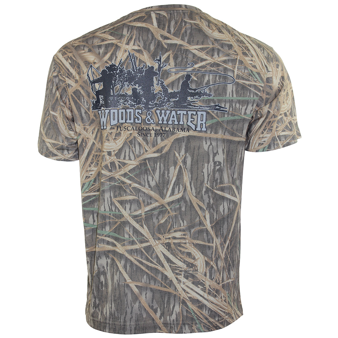 Woods & Water Tee with Trio logo on back and Woods & Water logo on left chest.
