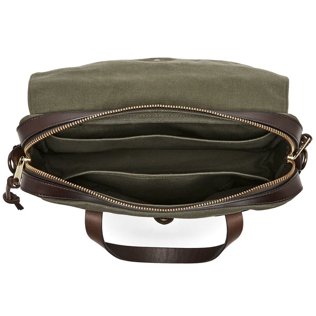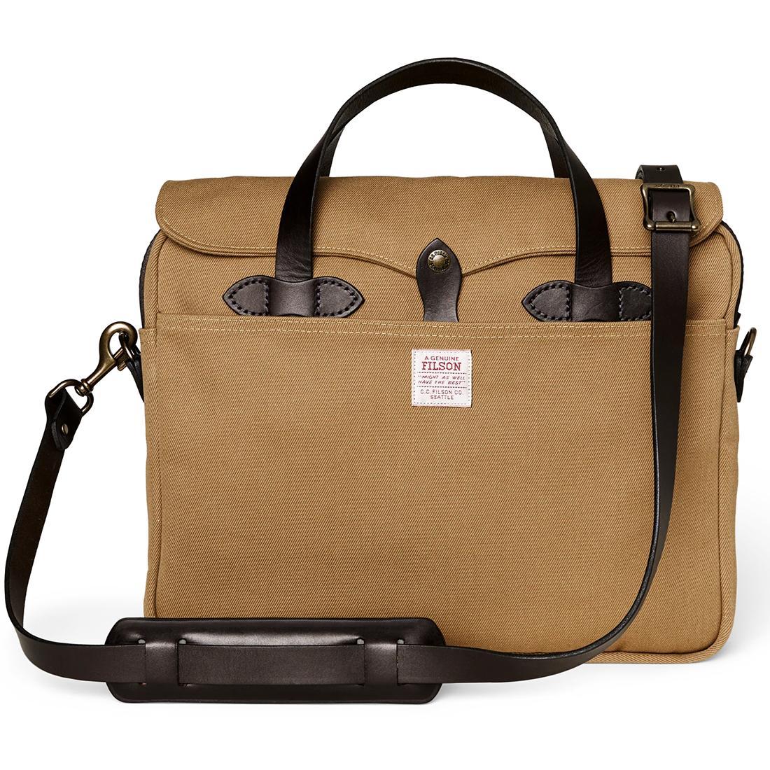 Made with their iconic Rugged Twill and Bridle Leather, the Filson Original Briefcase is built to survive any workplace, whether on land, at sea, or in the air. The lightly waxed fabric sheds water and withstands abrasion, year after year. The handles and detachable, adjustable shoulder strap are built with the same Bridle Leather that's used for making horse tack. The roomy interior has organizational dividers and space for a 15" laptop and secures with a YKK® solid brass zipper protected by a storm flap. A testament to our signature fabric's durability, one customer recorded over one million miles of travel with his Original Briefcase.