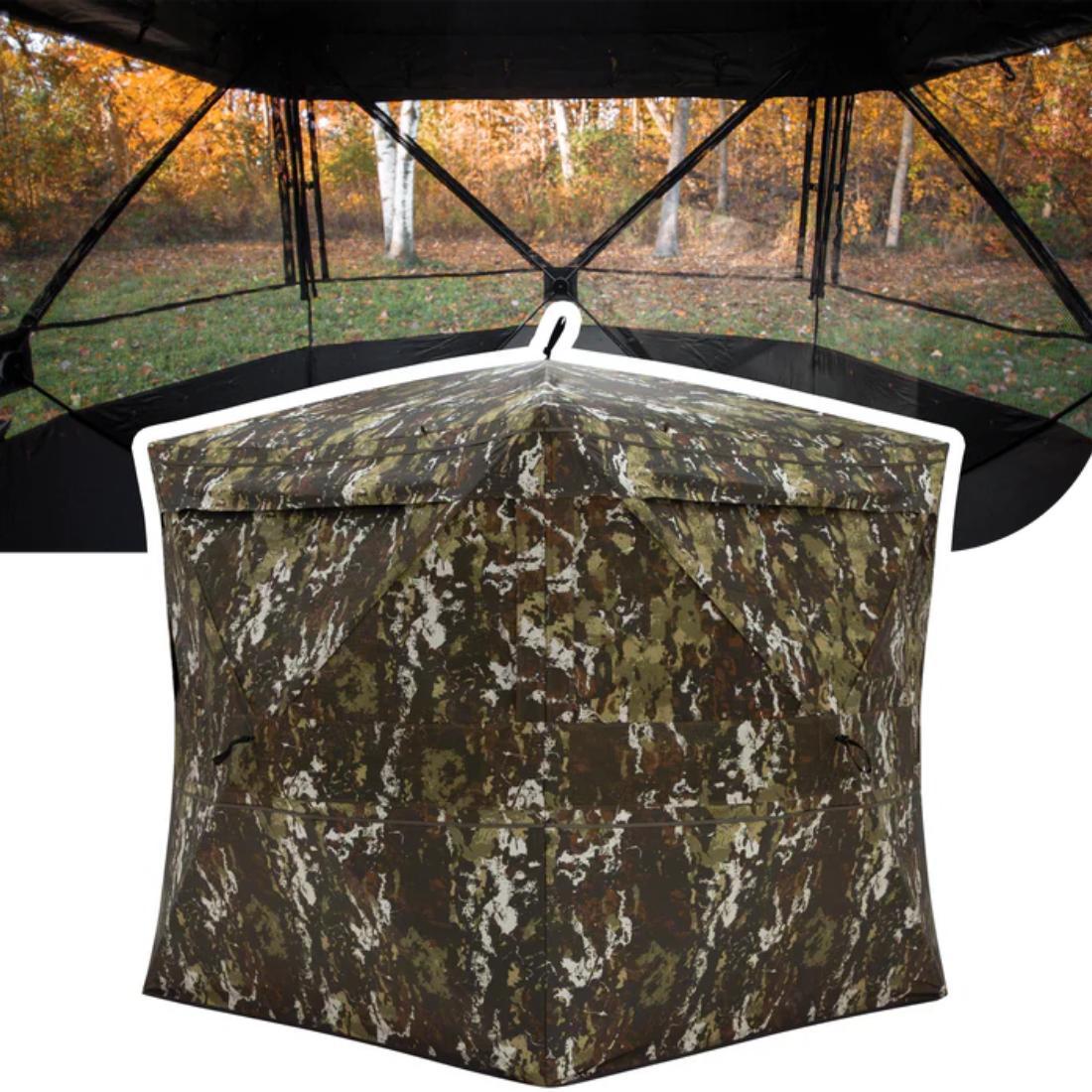 The Overwatch hunting blind is equipped with a View-Through one-way fabric, ensuring that you stay concealed from your prey while maintaining a clear view of your surroundings. Even the slightest movements can ruin a hunt, but this blind keeps you hidden in plain sight. The silent and adjustable panoramic front shooting windows provide you with the perfect vantage point, allowing you to take your next shot with ease. The Overwatch hunting blind comes with a rear peek window for additional viewing angles. Its water-resistant, tightly-woven, HD 150 denier fabric with a black interior coating ensures you stay dry and concealed even during unpredictable weather conditions. This hunting blind includes detachable blaze orange safety panels for use during gun hunting season ensuring you are visible to other hunters while remaining hidden from your prey. Additionally, the blind features brush holders for optional added concealment, allowing you to seamlessly blend into your surroundings. Included with the Overwatch is a carrying bag with backpack straps, 12 ground stakes, and tie-down ropes.?