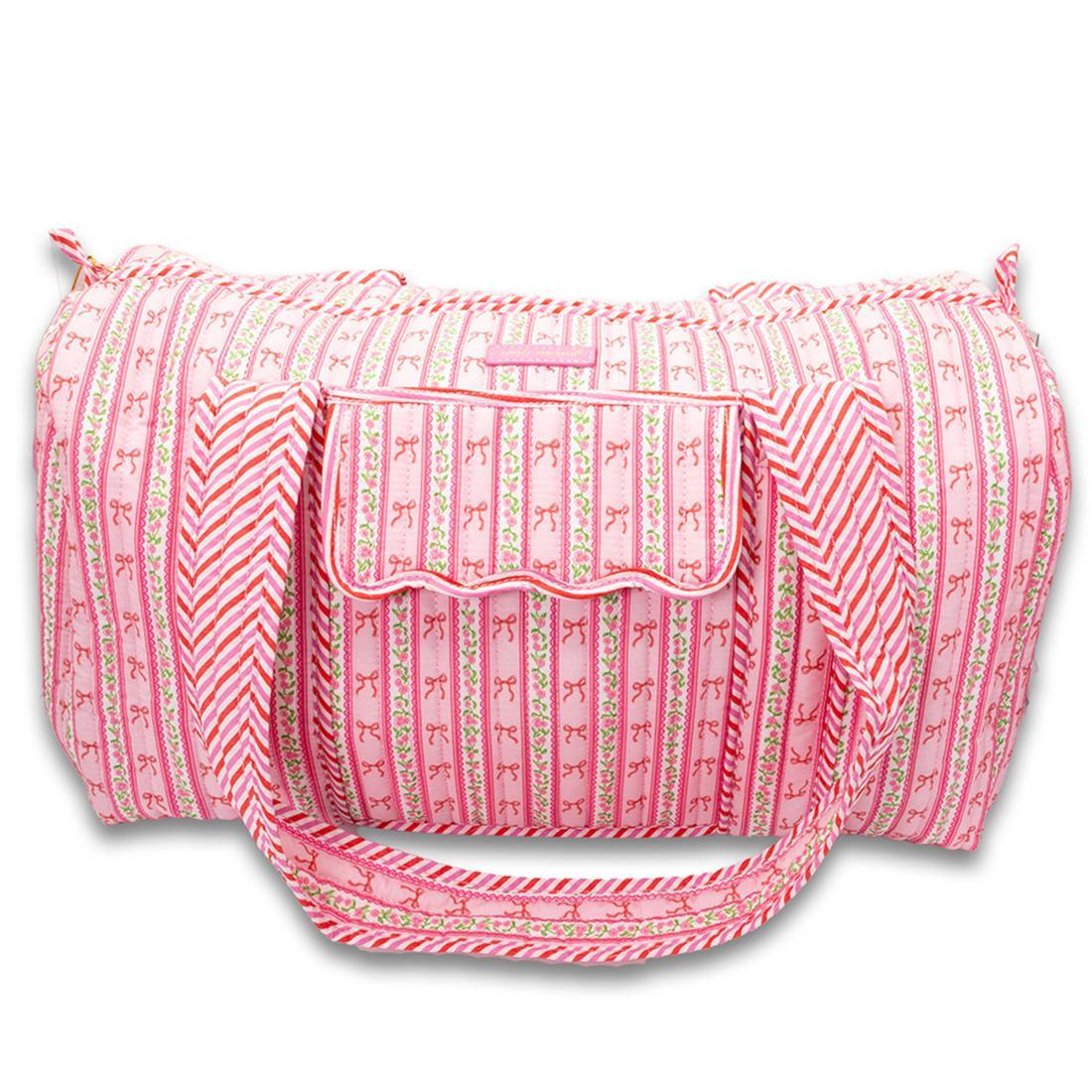 The Quilted Duffle Bag is the perfect carry on or weekend travel bag. It features two top carrying handles, a large main zippered compartment with an interior zippered pocket and two additional pockets, and the Simply Southern logo label.