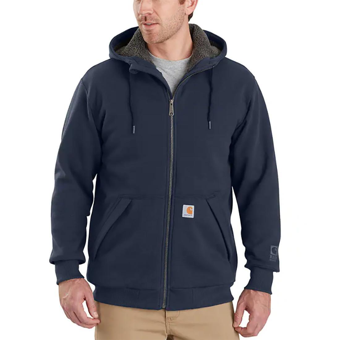Made for people with a no-excuse attitude to rain. This rugged sweatshirt keeps you warm on the job with a heavyweight cotton blend equipped for light precipitation. It has a thick sherpa lining, and there's a phone-sized pocket hidden in one of the handwarmer pockets on front. Previously known as the Rain Defender® Rockland Sherpa Lined Full Zip Hooded Sweatshirt.
