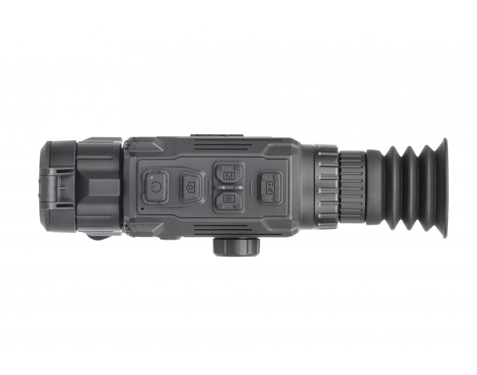This thermal scope features a 25mm Germanium lens, a 384 x 288 resolution thermal sensor, and a 2x base magnification with a detection range of up to 1200 m/yd. Out of the two 384-resolution options, this thermal scope has a lower base magnification and a wider Field of View (10.5° × 7.9° or 55 ft @ 100 yds) providing extensive area coverage while scanning