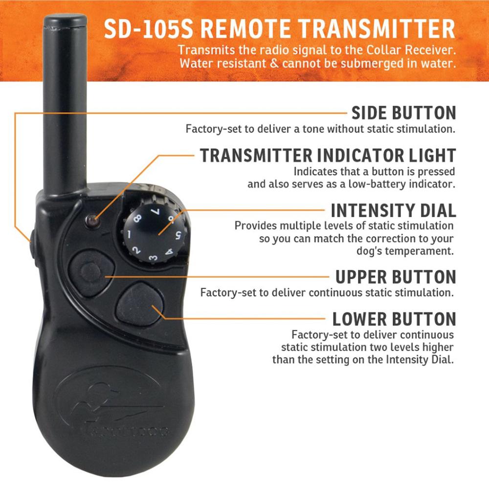 The YardTrainer 105S is designed specifically for tough or stubborn dogs, and is the perfect choice for introductory training and obedience. The SD-105S has a higher range of stimulation than the SD-105. The waterproof, compact Collar Receiver features a range of 100 yards, and the easy-to-use, water-resistant Remote Transmitter has 8 levels of stimulation and a tone-only button.